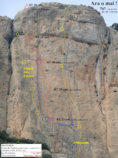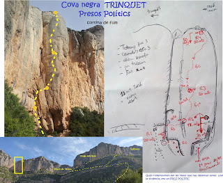 Un únic bolt de progresió (qui té les mans tacades de sang???) per protegir una secció de pedra dubtosa que millorará amb les repeticions , dos bolts nous en una reunió penjada, i altres dues reunions aprofitades de vies ja existents. No hi trobareu altra ferro.